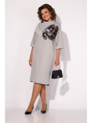 Очень лаконичное и стильное платье определённо привлечёт к себе внимание окружающих. Модель свободного «о»-образного силуэта. Левую часть плеча и груди украшает изысканная печать аппликация в виде цветка с декором из бусин и жемчуга. Платье с мягко лежащей стойкой у горловины. Рукав длиной ¾-ти, на притачной манжете на отворот. Модель слегка заужена к низу, с разно уровневым фигурным низом, оформленный обтачкой. В платье предусмотрены карманы.