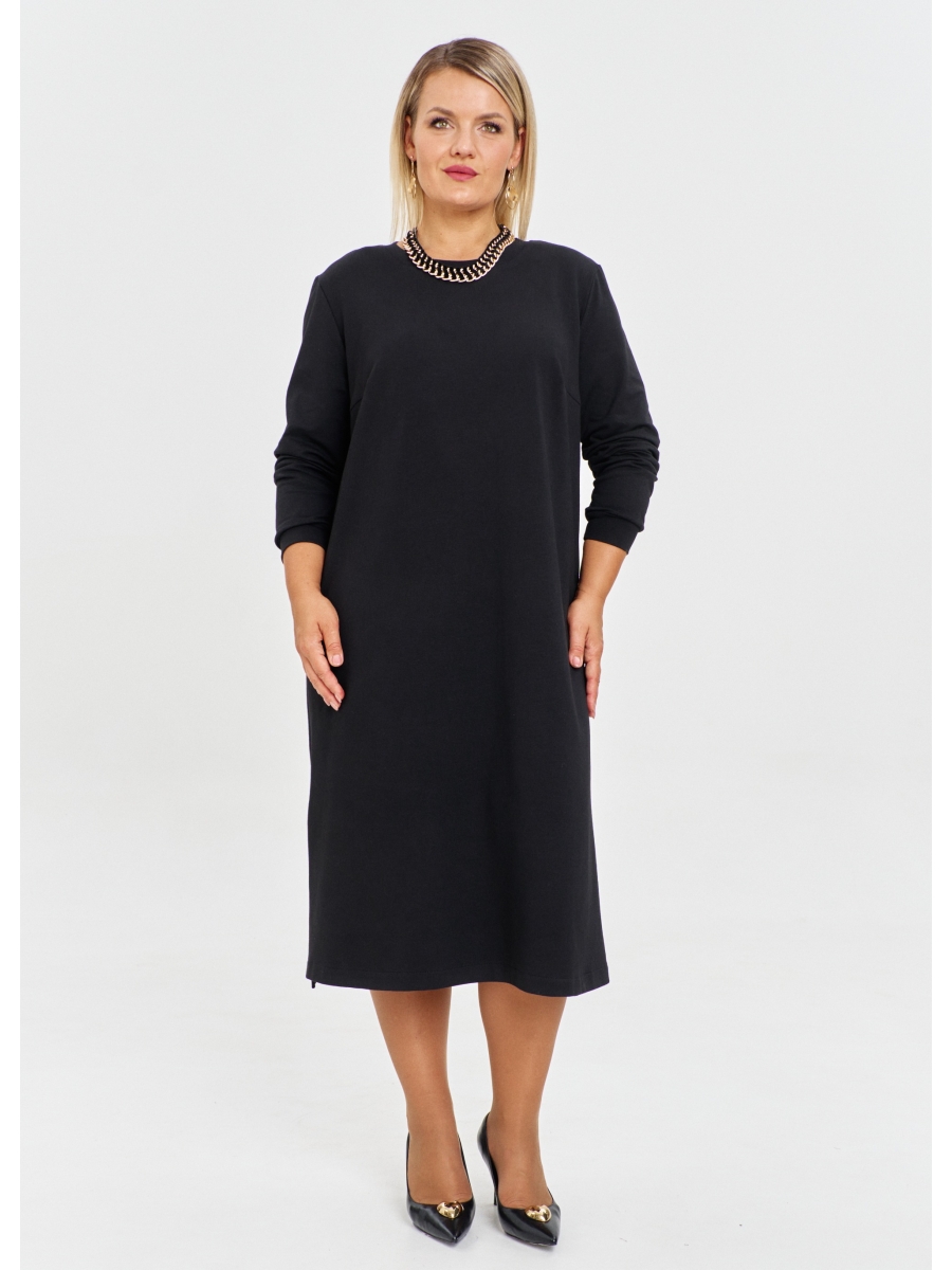 Платье прямое свободного кроя из премиум трикотажа. Платье с длинным полноразмерным рукавом с манжетом, с округлой горловиной, в боковых швах карманы и разрезы. В комплекте к платью идет дизайнерское украшение на шею из золотой цепи и черной бархатной ленты. Такое базовое платье - воплощение свободы движения, естественности уникальности каждой женщины. Оно отлично сидит на любом типе фигуры. Свободное современное трикотажное платье больших размеров можно легко стилизовать при помощи аксессуаров для разных событий, на работу и для прогулок.