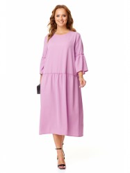 Платье свободного прямого кроя, выполненное из плательной ткани (не тянется). Платье отрезное ниже линии талии. Верхняя часть переда и спинки цельные, в нижней части отрезной присборенный волан. Горловина платья по переду - округлой формы, по спинке - фигурной формы, завязывается на бант из основной ткани. Рукава втачные, одношовные с отрезными присборенными воланами.