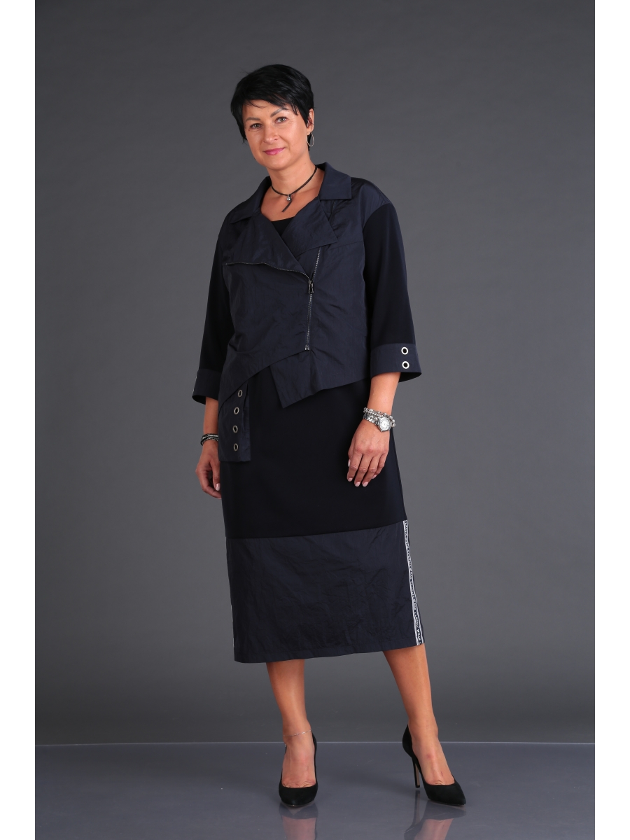 Оформить заказ →Платье женское прямое из двух видов ткани: костюмной и органзы, подходящих по тону. По переду платье из двух слоев. Нижнее платье из костюмной ткани с двумя нагрудными вытачками. На правой стороне накладной карман – портфель с четырьмя люверсами. Верхняя часть переда в виде куртки–косухи с застежкой на тесьму-молнию из органзы. Спинка на кокетке, декорирована настрочной тесьмой с буквами. Рукав одношовный с манжетой из отделочной ткани и двумя люверсами. По низу платья притачена широкая отрезная деталь из органзы, с настроченной тесьмой с буквами по бокам.