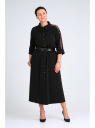 Платье полуприлегающего силуэта из костюмной ткани, отрезное по линии талии с юбкой трапециевидной формы. Застежка на петли и пуговицы. В боковых швах обработаны карманы.