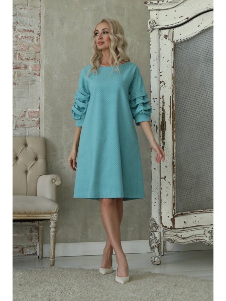 Обаятельное платье А-силуэта из текстильной ткани мятного цвета. Круглый вырез изделия обработан внутренней обтачкой. Втачные рукава со спущенной проймой дополнены декоративными защипами, по низу рукавов — манжеты. Жемчужный воротник в комплект не входит. Артикул воротничка Бу-610/87