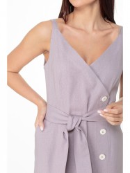 Полуприлегающий силуэт, перед отрезной по линии талии. Спинка со средним швом и талиевыми вытачками. Лиф с вертикальными рельефами от линии проймы, нижняя часть переда с боковыми карманами и складкой с разрезом, имитирующие запах, подчёркнут пуговицами. В правом боковом шве внизу имитация шлицы с пуговицами. Сарафан дополнен съёмным поясом.
