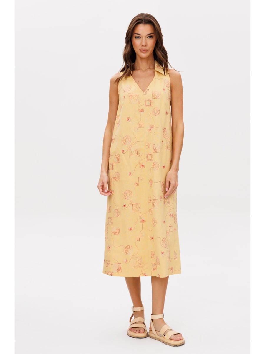 Льняное платье-это про натуральность и комфорт. Оно идеально для жарких дней, выглядит обворожительно и наряду с этим крайне удобно и красиво. Свободный А-силуэт, английская пройма, V-образный вырез, воротник, фигурная линия низа. Полочка с центральным швом, боковыми рельефами с фигурными карманами. Спинка со средним швом, боковыми рельефами. Особую привлекательность модели придает широкая подгибка низа.