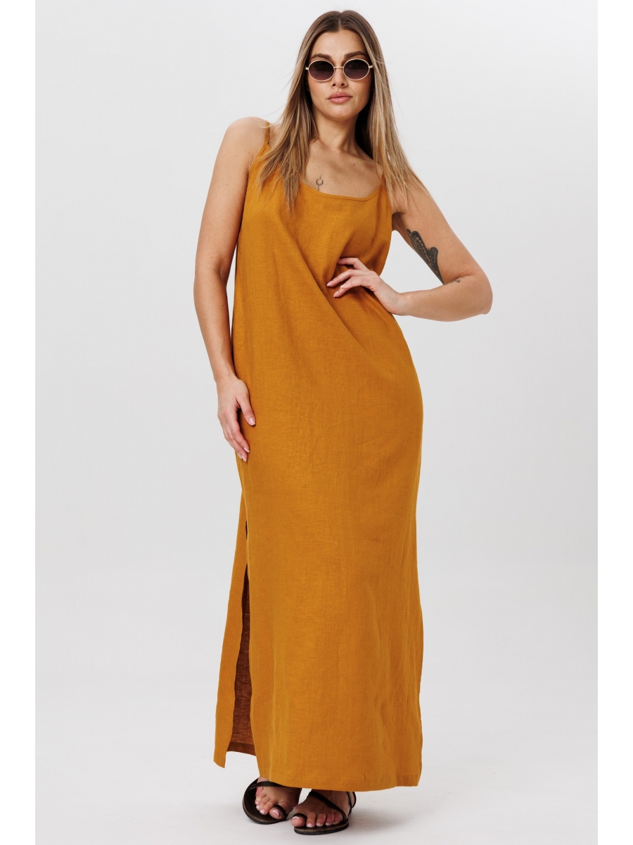 Длинный льняной сарафан AMIE by Ma Cherie в пол. Свободный сарафан на тонких бретелях. Перед и спинка цельные. Перед с нагрудными вытачками, на спинке декоративная нашивка. В боковых швах функциональные карманы и разрезы. Пройма обработана окантовкой, переходящей в бретелю.