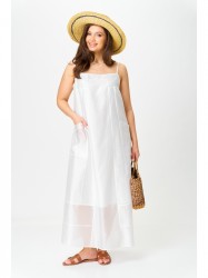 Сарафан летний, выполнен из вискозного тонкого полотна с гладкой шелковистой поверхностью, очень лёгкий, невесомый, идеальный вариант для жаркого лета. Сарафан А-обратного силуэта на тонких регулируемый бретелях. По переду выполнены конструктивно-декоративные подрезы и швы; 2 накладных кармана. Спинка аналогично переду. Сарафан без застёжки. Сарафан на подкладке.