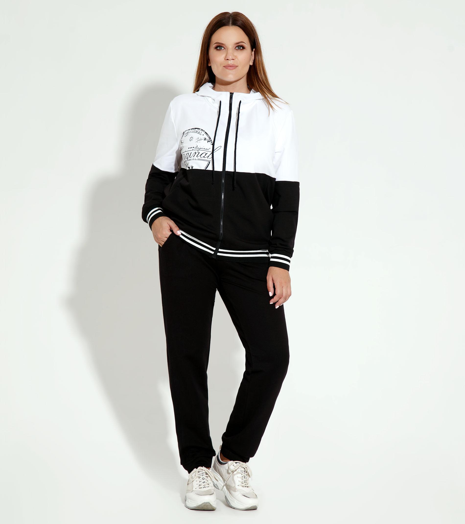 Эффектный , стильный и очень практичный спортивный костюм состоит из куртки и брюк. Куртка на молнии. Рукав втачной,длинный,снизу на притачной трикотажной полосатой манжете. Низ куртки также обработан манжетой.По переду ,спинке и рукавам на уровне груди выполнен горизонтальный рез,делящий изделие на чёрный низ и светлый верх. Рывез горловины круглый,в него оформлен удобный капюшон,переходящий спереди в стойку. По краю капюшона протянут шнур. Спрала пго полочке нанесён графичный принт. Максимально яркая и эффектная хлопковая куртка на каждый день и для активного отдыха. Брюки прямые,снизу на манжете из основной ткани. Пояс отрезной на резинке и со шнуром,завязывающимся спереди. Боковые швы чуть смещены вперёд. Параллельно боковым швам выполнен отрезной лампас из основной ткани,переходящий сверху в удобный внутренний карман.Вход в карман по косой. Максимально комфортная модель для активного отдыха и прогулок.