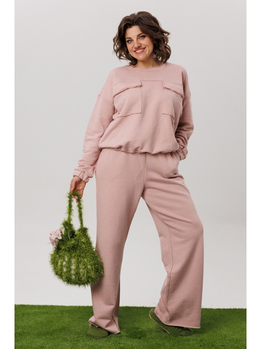 Брюки продолжают философию комфорта, предлагая прямую посадку на эластичном поясе, который мягко сидит по фигуре, не стесняя движений. Лаконичный дизайн дополнен практичными боковыми карманами. Подлинной изюминкой всего комплекта становятся намеренно открытые срезы, привносящие в образ ноту дерзкого шика.