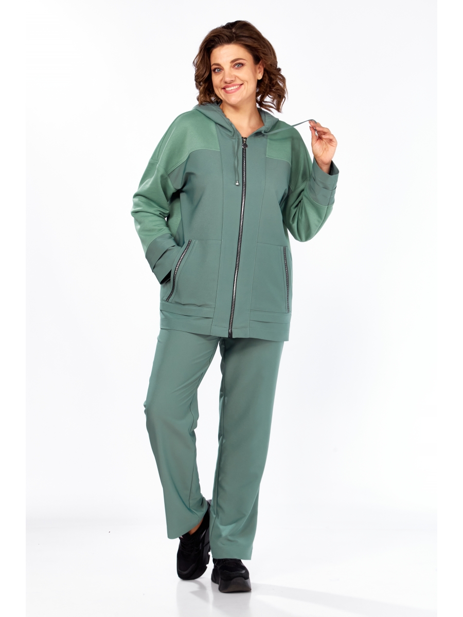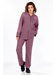 Жакет-худи с центральной застёжкой на молнию, имеет спущенную линию плеча. На переде обработаны кокетки, планки, накладные карманы с отделочной тесьмой, по низу застрочены декоративные складки. Спинка с кокеткой и средним швом. Рукав спущенный, длинный, на манжете заложена декоративная складка. Горловина обработана притачным капюшоном с кулисой.