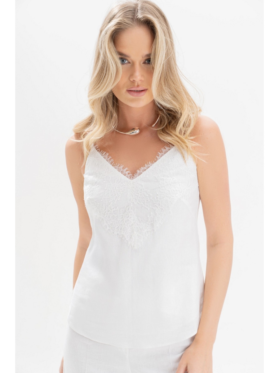 Топ женский, на бретелях, полуприлегающего силуэта, выполнена из льняной ткани на х/б подкладке, может быть как нарядная, так и повседневная. Перед с нагрудными вытачками, выходящими из боковых швов. Верхняя часть переда декорирована кружевом. Низ переда и спинки фигурной формы: короче у боковых швов, длиннее к центрам.
