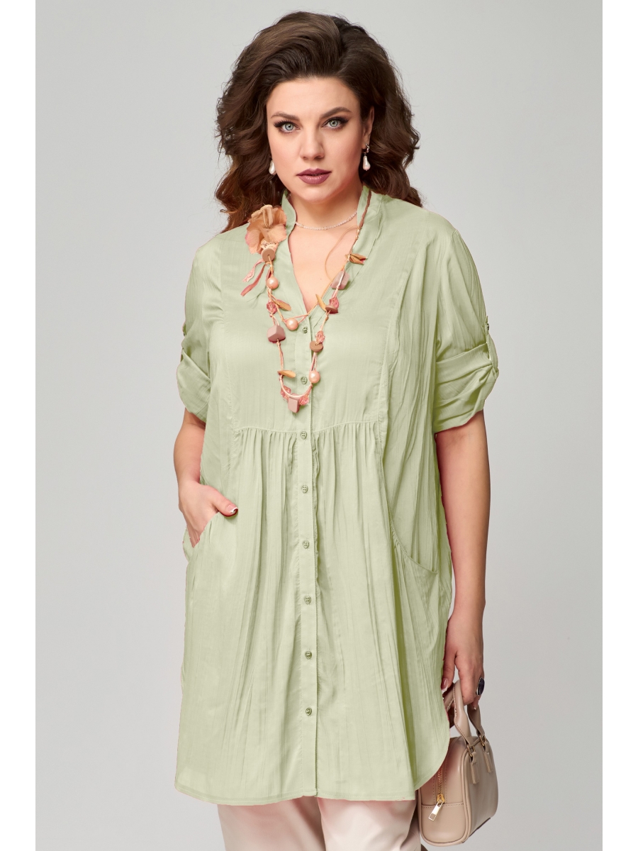 Туника ""Медея"" — это воплощение женственности и изящества, где каждая деталь продумана до мелочей. Свободный силуэт дарит легкость и комфорт, позволяя ткани мягко струиться, подчеркивая естественную грацию движений. Изящный фигурный вырез горловины, дополненный отрезными планками, придает образу нотку элегантности, а высокий воротник-стойка добавляет благородного шарма. Длинные втачные рукава, украшенные притачной манжетой с застежкой на пуговицы, позволяют регулировать длину с помощью паты, обеспечивая удобство и стиль. По переду — аккуратные фигурные карманы, украшенные деликатной сборкой, создают легкий акцент, а подрез по линии талии с мягкой драпировкой придает образу женственность и динамику.