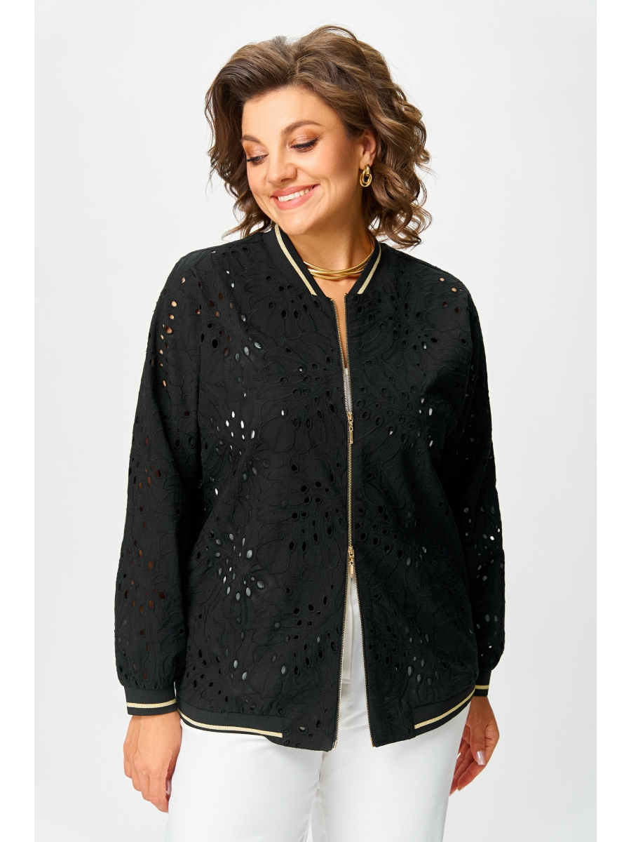 Бомбер женский из хлопчатобумажной лёгкой ткани «ришелье» свободного кроя со спущенной линией плеча и с центральной застёжкой на декоративную молнию. В боковых швах обработаны карманы. Горловина округлая со стойкой из трикотажного контрастного довяза. Рукав длинный. По низу рукава и изделия - довяз.