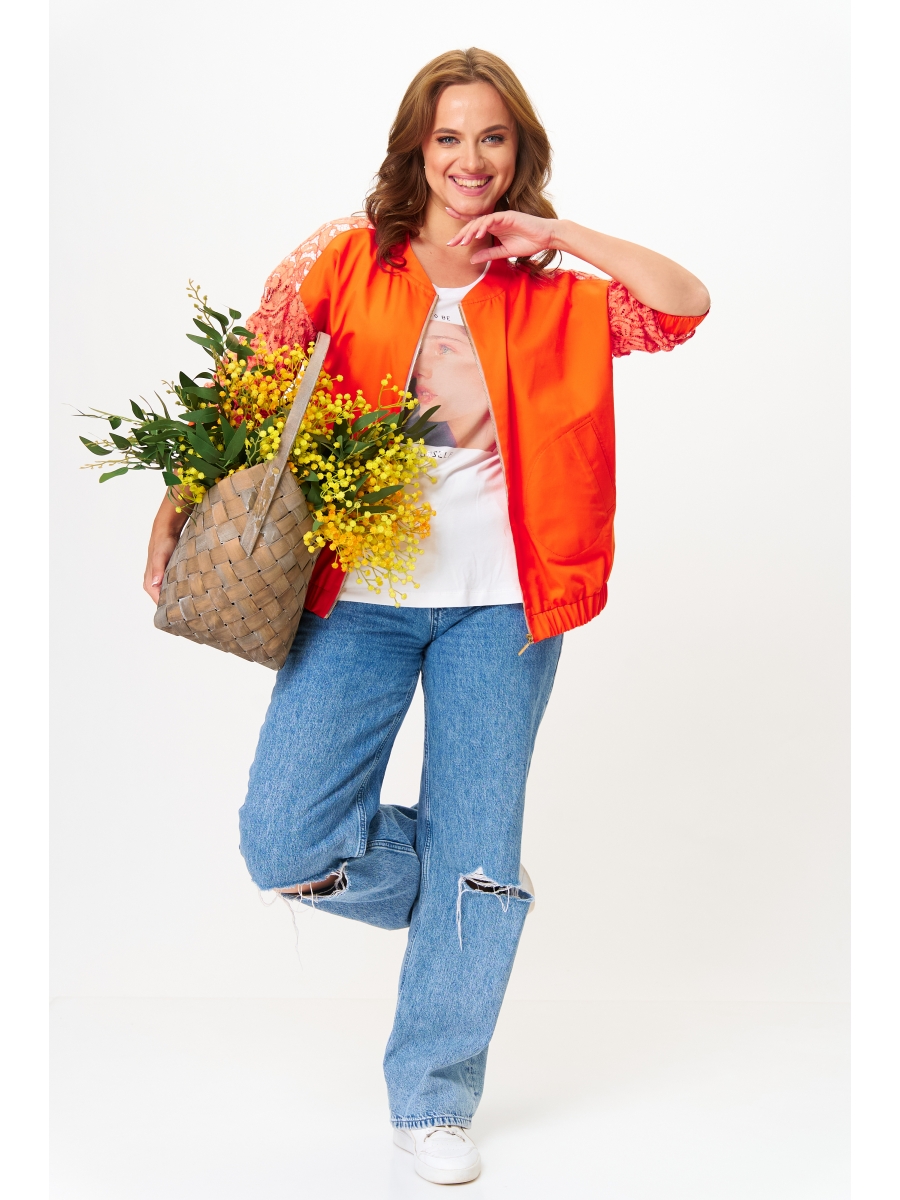 Бомбер женский скомбинирован из текстиля и гипюра , отлично подойдет для торжественных случаев и так же для летних прогулок . Застежка центральная на металлическую молнию . Спереди прорезные карманы в рамку с втачной листочкой и отделочной строчкой по контуру мешковины .
