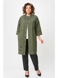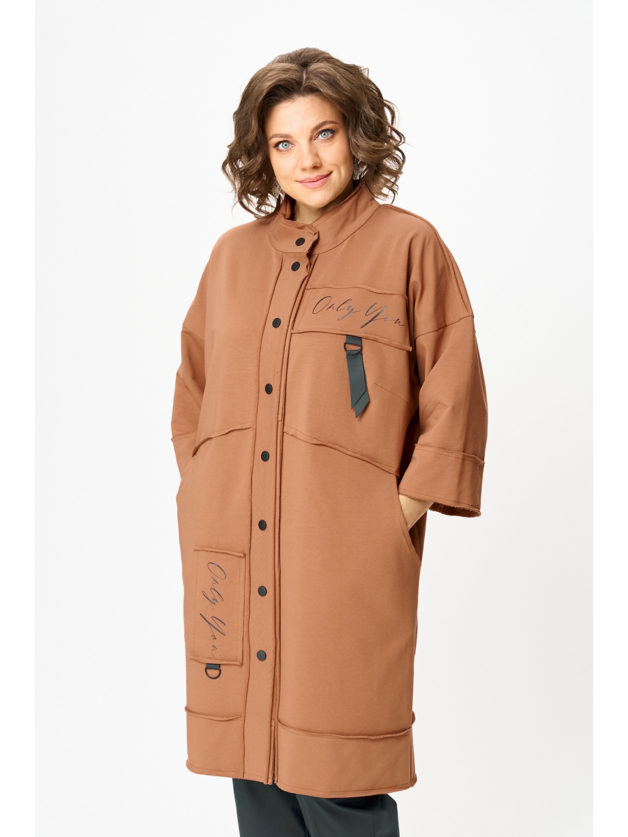 Кардиган женский прямого силуэта из трикотажной ткани (двунитка-футер). На полочке и спинке расположены декоративные, необработанные швы. В верхней и нижней части переда есть настрочные элементы с печатью и тесьмой. По переду изделия карманы. Спинка со средним швом и кокеткой. На кокетке расположен элемент с печатью и тесьмой. Рукав спущенный с манжетой. Вырез горловины оформлен стойкой. По переду изделия планка с кнопками.