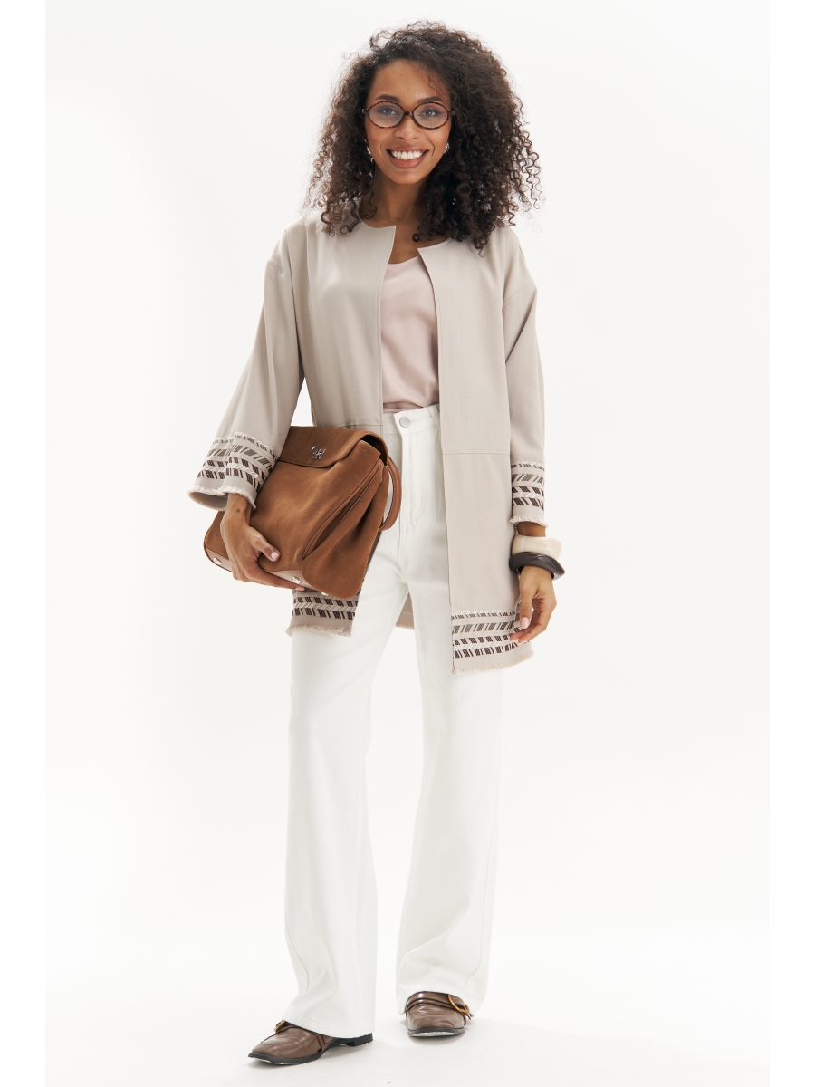 Кардиган отлично подойдет для ежедневной носки в весенне-летний период. Полочки кардигана с горизонтальными подрезами на уровне линии талии. Спинка со средним швом. Горловина круглой формы, обтачная. Рукава втачные одношовные со спущенной линией проймы, длиной 3/4. Низ изделия и низ рукавов с бахромой и вышивкой. По проймам, среднему шву спинки, подрезам переда, горловине и краям борта расположена отделочная строчка шириной 0,5.