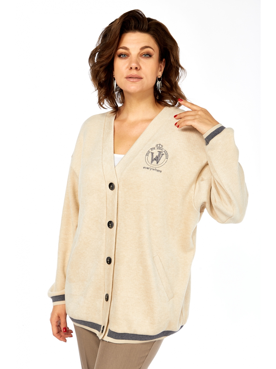 Кардиган женский, изготовлен из трикотажного полотна. Горловина V-образной формы, застежка отрезная планка на петли и пуговицы. Карманы с листочками. По низу изделия и низу рукавов-декоративные довязы. Спинка цельнокроенная. Рукава спущенные длинные. Отделочный элемент — вышивка на детали переда.