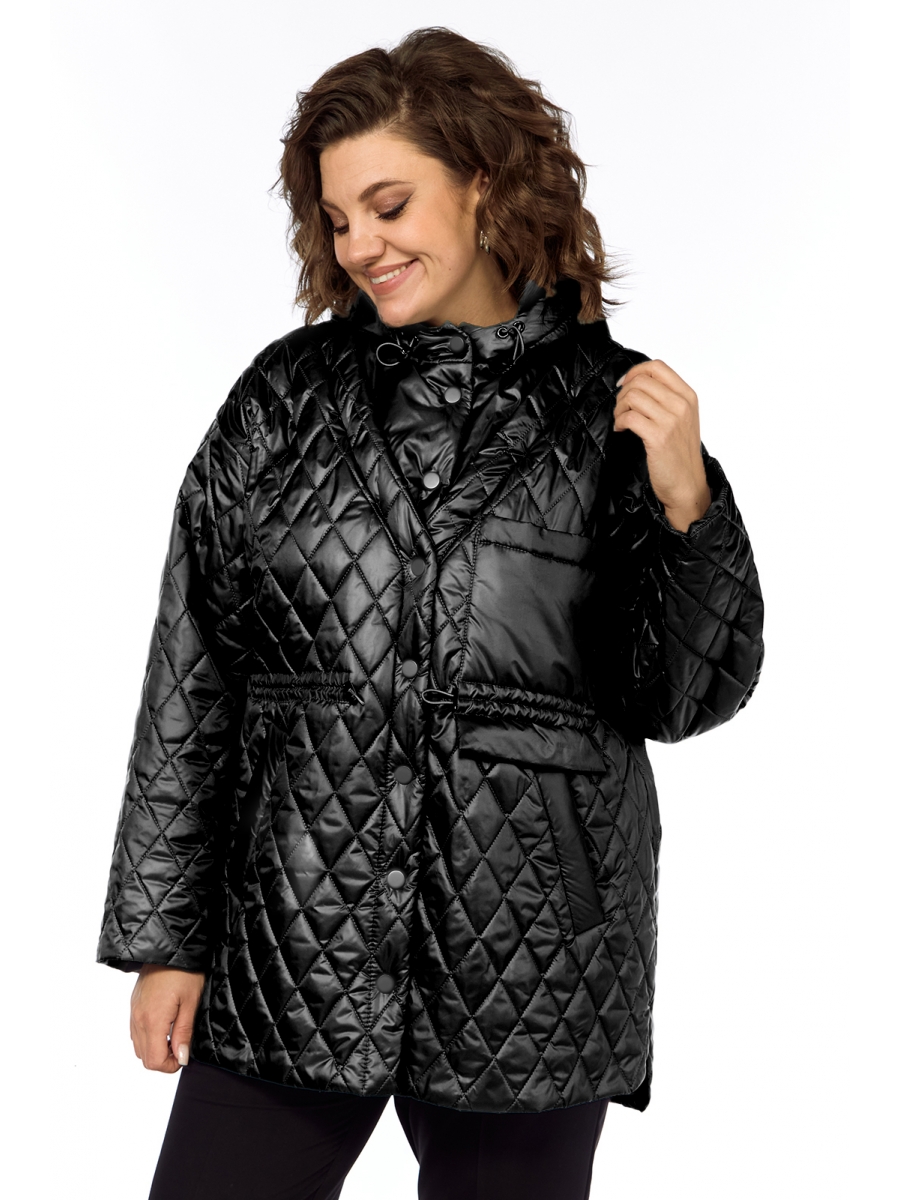 Куртка женская стеганная с капюшоном, свободного силуэта. Застежка центральная на пробивные кнопки. Полочка с фигурной вставкой из отделочной ткани, с накладным карманом и декоративными кулисами. Имеются прорезные карманы с листочкой. Спинка цельная. Рукава спущенные. Низ фигурной формы.
