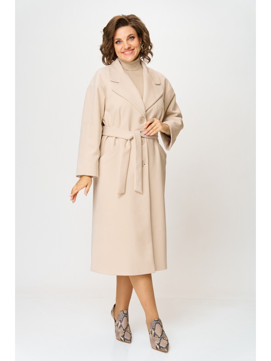 Элегантное женское пальто из мягкой пальтовой ткани с добавлением шерсти, на подкладке. Силуэт прямой, удлиненное, однобортное, с застежкой на пуговицы, по переду фигурные кокетки и прорезные карманы-листочки, линия плеча слегка опущена, рукав длинный, в боковых швах высокие разрезы, особую нарядность пальто придает оригинальная форма линий воротника и лацкана.