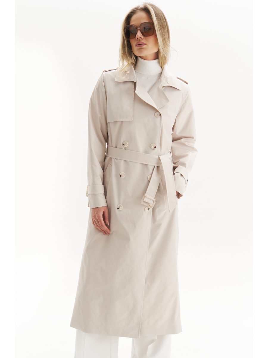 Плащ женский, прямого силуэта, выполнен из плащевой ткани, на подкладке, с двубортной застежкой на 7 петель и 10 декоративных пуговиц до верха (размер и цвет фурнитуры может незначительно отличаться от фото), для повседневной носки. Борта могут быть застегнуты до верха, или расстегнуты с разложенными в разные стороны лацканами. Плащ со съемным поясом и декоративной пластиковой пряжкой, с настрочными шлевками по линии талии. Перед и спинка с отрезным бочком. Перед с прорезными карманами с листочками. Правая часть переда с отлетной кокеткой. Спинка с отлетной кокеткой, со средним швом в нижней части которого обработана шлица. Горловина оформлена стояче-отложным воротником со стойкой. Рукава втачные, двухшовные, по низу с настрочными шлевками, с патами с декоративными пластиковыми пряжками. Плечевые швы с погонами, застегивающимися на 1 петлю и 1 пуговицу.