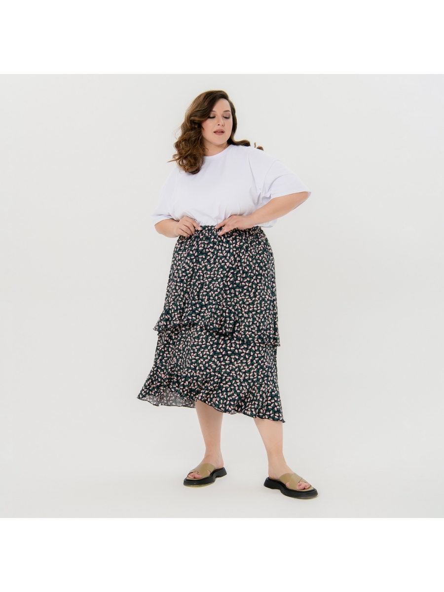 Ниже уровня бедер проходит подрез, в который вставлен волан.