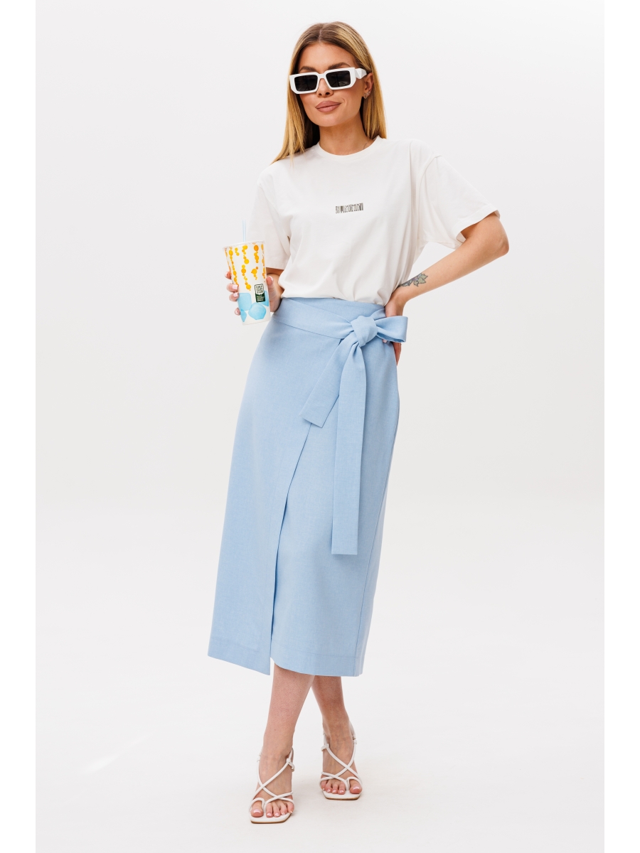 Юбка свободного силуэта с имитацией запах с завязками. В среднем шве по спинке застежка на тесьму молнию.