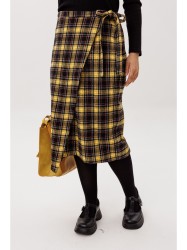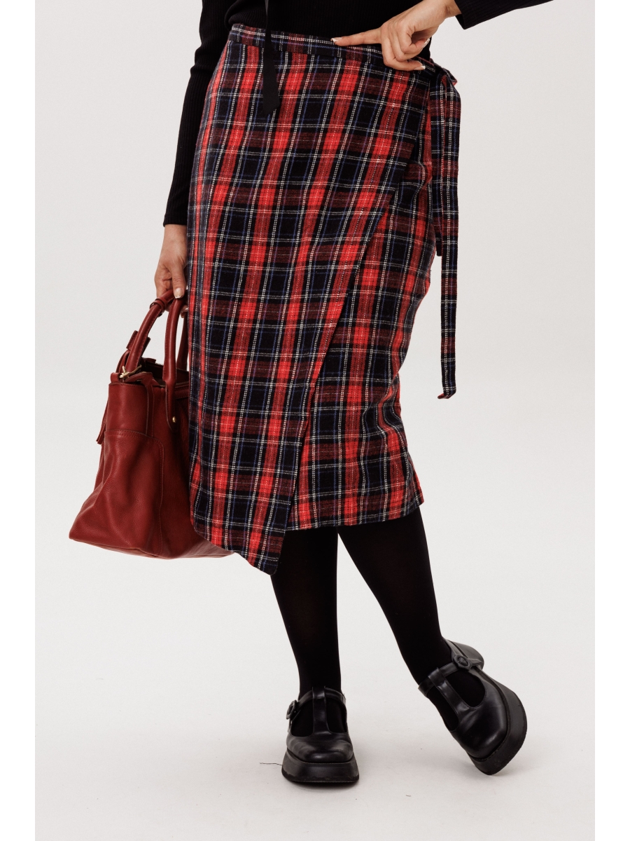Теплая юбка на запах миди-длины — идеальный атрибут для прохладной погоды. Асимметричный край разбавляет строгость образа игривостью и придает ему смелости.