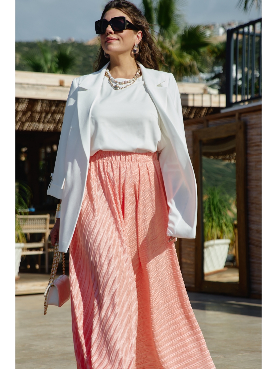 Юбка «полусолнце» в длине миди с жатой фактурой — это сочетание лёгкой драматичности и непринуждённой элегантности. Её силуэт создаёт мягкую визуальную волну, а жатая поверхность превращает каждый изгиб в игру света и тени: она одновременно утончённая и характерная, романтичная и по-городски современная. Из-за сжатой фактуры ткани юбка выглядит живой и объёмной.