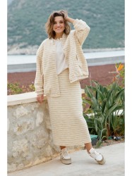 Юбка длины «миди» является своеобразной базой, которая легко комбинируется с различным верхом, позволяя быть разной, делая любой образ интересным. Юбка прямого силуэта с притачным поясом со вставкой эластичной тесьмы-резинки в бочках. В среднем шве заднего полотнища юбки застёжка на молнию и пуговицу в поясе, и с разрезом от низа. Юбка на подкладке.