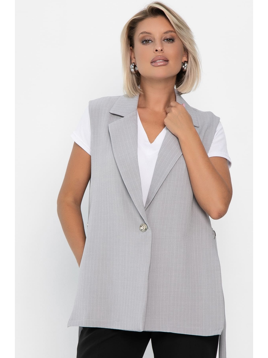 Представляем вашему вниманию женский жилет в классическом стиле серого цвета, который станет стильным дополнением к вашему образу! Жилет имеет английский воротник с пуговицей на передней части. По бокам расположены пояса на полукольцах, которые можно завязать на спине. На задней части жилета есть шлица. Жилет не соединён по бокам, но имеет пояс с полукольцами, что придаёт ему особый шарм. Это изделие станет изюминкой вашего гардероба. Сочетайте её с юбкой-карандаш, джинсами, платьем или брюками, чтобы создать неповторимый образ.