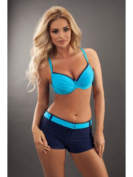 Голубой купальник Ofelia с чашкой push-up на косточках. Бретели регулируются по длине, на спине нерегулируемая пластиковая застежка. Плавки-шорты темно-синего цвета с высокой талией. Фото обратной стороны купальника представлено в ознакомительных целях и показывает крой задней части, расцветка соответствует основному фото в карточке товара.