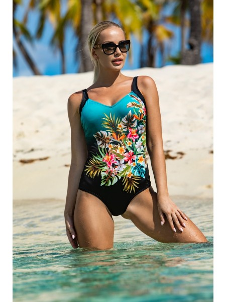 Слитный купальник Augustina черного цвета с оригинальным цветочным принтом спереди. Модель с мягкой вшитой чашкой и широкими регулируемыми бретелями. На спинке глубокий U-образный вырез. Особый крой и специальная приятная для кожи подкладка позволяют использовать купальник для активного отдыха и занятий в бассейне.